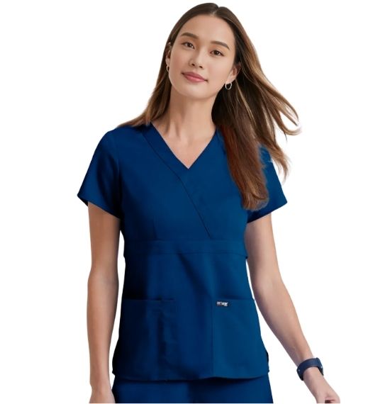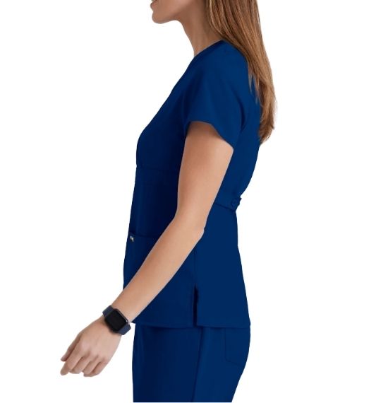 The Grey’s Anatomy 3 pocket mock wrap top, a proven customer favorite, earns its popularity by showcasing your figure in its finest form. In addition to the flattering mock wrap design and adjustable back tabs, you’ll appreciate the super soft fabric that makes up the Grey’s Anatomy mock wrap scrub top.