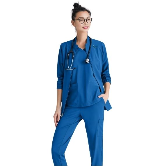 Complete your favorite Grey’s Anatomy Evolve Stretch scrub set with the athleisure-inspired Virtue warmup. Featuring two spacious pockets and a signature green badge loop to keep important items close by. Made with recycled polyester and CiCLO® technology, the fabric is soft, stretchy, and breathable for all-day comfort.